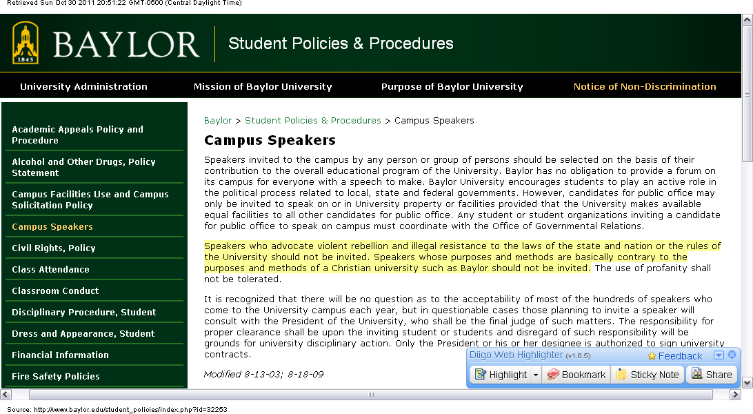 Among those isolated for criticism in panelist remarks (.docx) included Governor Rick Perry, U.S. Senator John Cornyn, local law enforcement, the Republican Party conservatives, Glenn Beck, Rush Limbaugh, and “the far right”. Baylor University’s student policy handbook states that in selection of guest speakers, “Particular concern should be taken that the University not be politicized.”